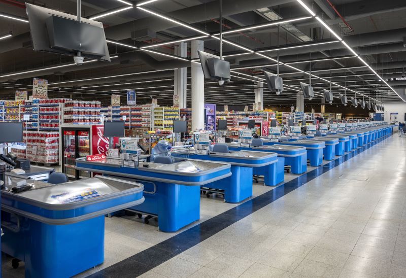 En línea de cajas se armó una grilla lumínica con la luminaria Iba mod. 470 con una temperatura de color de 4.000 grados Kelvin resaltando los check outs y las ante cajas .