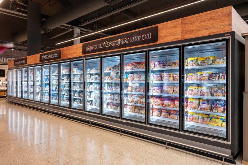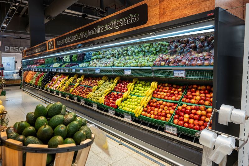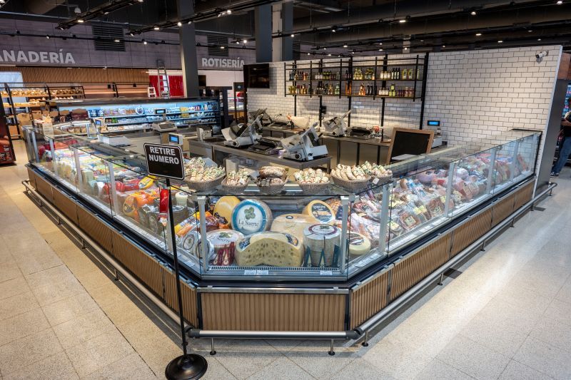 El salón de ventas cuenta con murales con puertas vidriadas de la línea Osaka, para los sectores de Lácteos, Quesos y Fiambres; exhibidoras abiertas Panama 100 para Frutas y Verduras; y vitrinas Venezia para atención personalizada. Se combinaron las líneas Astana y Vislanda, ampliando la propuesta de exhibición con un diseño moderno y funcional para productos Congelados.