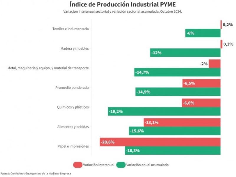 Cuatro de los seis sectores manufactureros del segmento pyme tuvieron caídas en la comparación anual, siendo los más afectados “Papel e Impresiones” (-20,6%) y “Alimentos y Bebidas” (-13,1%). “Maderas y muebles” y “Textiles e indumentaria” presentaron aumentos del 0,3% y 0,2% respectivamente.