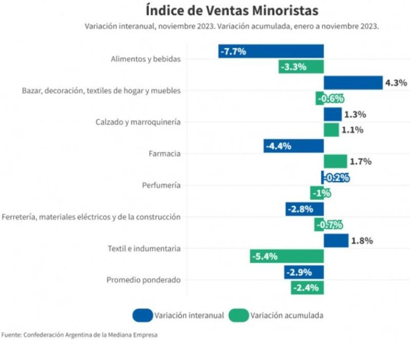 Así surge del Índice de Ventas Minoristas Pymes de la Confederación Argentina de la Mediana Empresa (CAME), elaborado en base a un relevamiento mensual entre 1.320 comercios minoristas del país, realizado del 30 de noviembre y el 1 de diciembre.