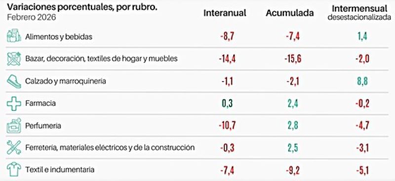 El relevamiento por rubros ratificó el proceso de contracción: seis de los siete sectores monitoreados cerraron con resultados negativos. Las bajas se encontraron en Bazar y decoración (-14,4%), Perfumería (-10,7%) y Alimentos y bebidas (-8,7%). Farmacia constituyó la excepción, con un incremento del 0,3% interanual.
