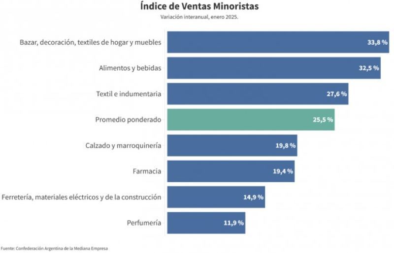 En enero, los siete rubros relevados registraron subas interanuales en sus ventas. El mayor incremento se detectó en Bazar, decoración, textiles de hogar (+33,8%), seguido por Alimentos y bebidas (+32,5%) y Textil e Indumentaria (+27,6%).