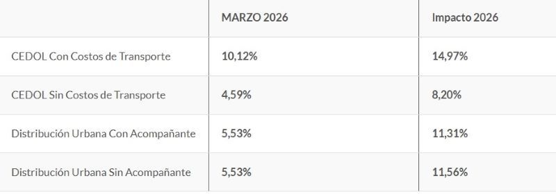 El incremento salarial pautado para el mes de abril alcanza el 7,29%, a lo cual debe adicionarse la incorporación del Premio por Presentismo y Puntualidad en la rama de operaciones logísticas. Esto motivó la elaboración de una proyección de impacto para el mes en curso por parte del Departamento Técnico de CEDOL. De esta forma, los valores proyectados como piso de aumento para el mes de abril 2026, sin tener en cuenta eventuales aumentos de combustible, son: